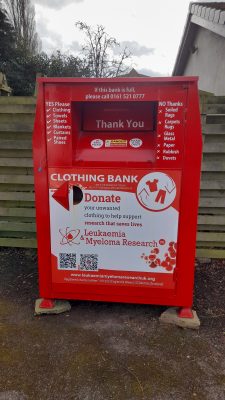 We have been approached by the Leukaemia & Myeloma Research charity to host a clothing bank collecting bin, initialy for a 6 month trial period. The ‘bin’ is an approx 6 foot metal cube: it is a rather gaudy colour but we are looking at screening it from the road. Yes, this defeats it’s noticeability but we are in a conservation area which we support… The planners were approached and indicated it should be located towards the rear of the site and we were happy to comply.